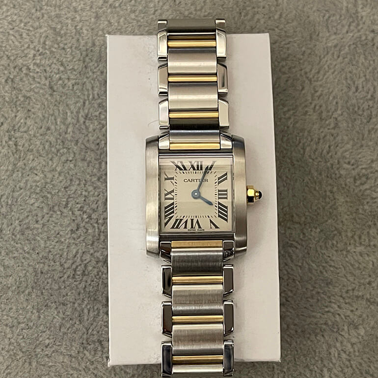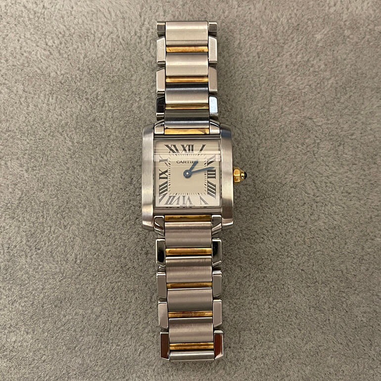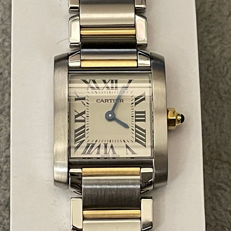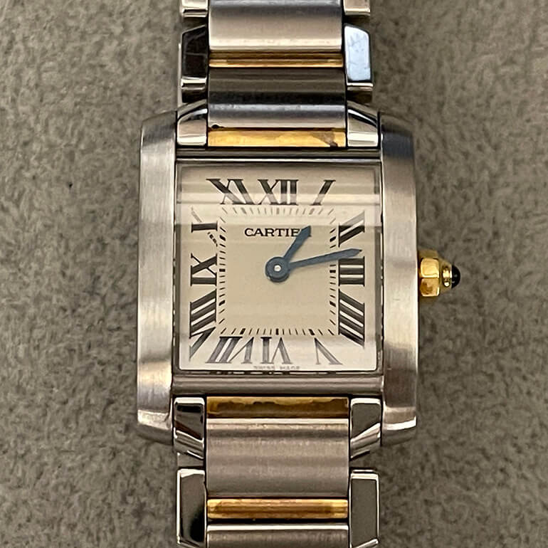「このカルティエ タンクフランセーズ、長年愛用しているんだけど、コンビの金色の部分が少し変色してきて…」