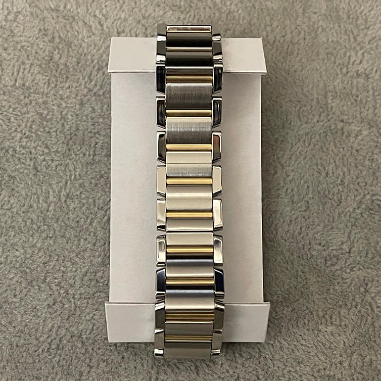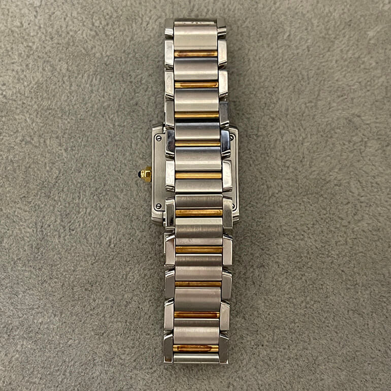 今回お預かりしたのは、まさにそのような状態のカルティエ タンクフランセーズでした。ステンレスとゴールドのコンビネーションが美しいモデルですが、金色の部分がくすみ、輝きが失われている状態でした。